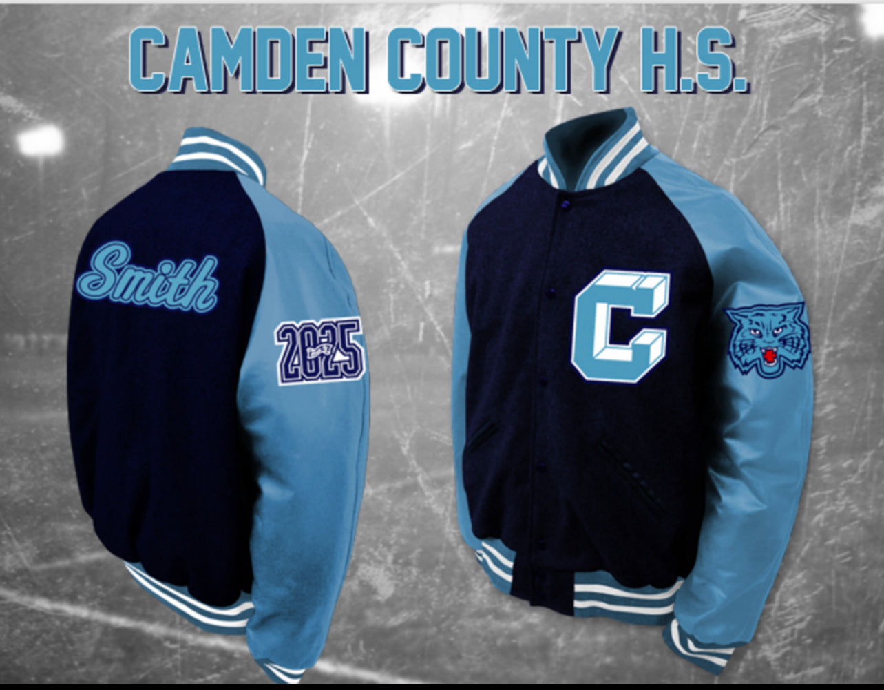 This is the official Letterman Jacket for Camden County High School located in Kingsland, GA. For in school order days during the school year please contact our office at 912-764-9314 or info@gradnow.com